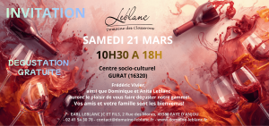 La famille Leblanc sera présente à Centre socio‑culturel de Gurat pour une journée de dégustation de nos vins le samedi 21 mars 2026, de 10h30 à 18h.