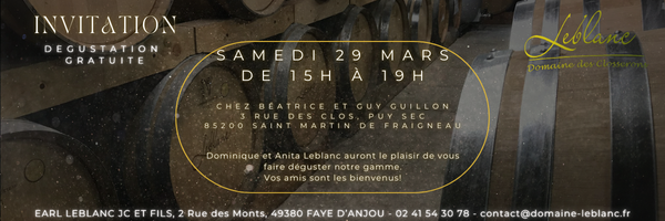 avant le 27 Mars par téléphone au 02 41 54 30 78 ou par mail sur contact@domaine-leblanc.fr