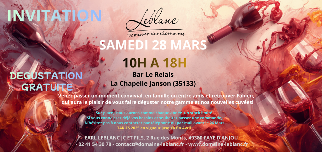Sur place, nous aurons un stock limité, de ce fait vous pouvez dès à présent, si vous le désirez, nous adresser vos commandes avant le 26 MARS par téléphone au 02 41 54 30 78 ou par mail sur contact@domaine-leblanc.fr